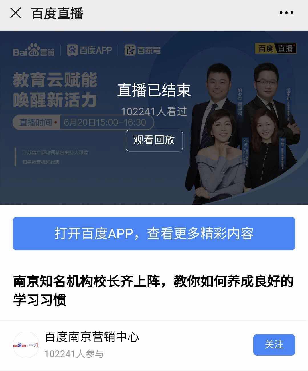 6月20日,百度營銷聯(lián)合江蘇廣播、厚學(xué)網(wǎng)發(fā)起的“教育云賦能 喚醒新活力”——百度營銷助力南京教育培訓(xùn)業(yè)復(fù)蘇公益計劃直播專場圓滿落幕。